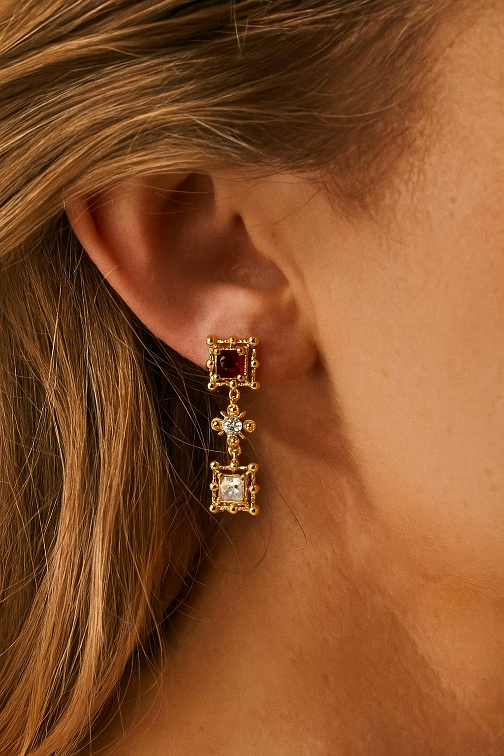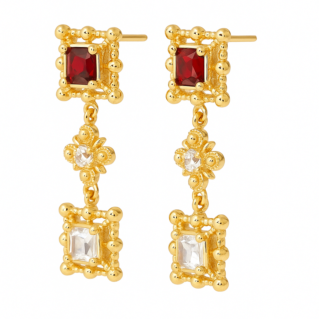 These exquisite 925 sterling silver 14k gold plated drop earrings feature a rich ruby-red stone paired with clear square-cut crystals in an ornate beaded frame. Combining elegance and vintage charm, they add a regal touch to any outfit, perfect for both special occasions and statement everyday wear.