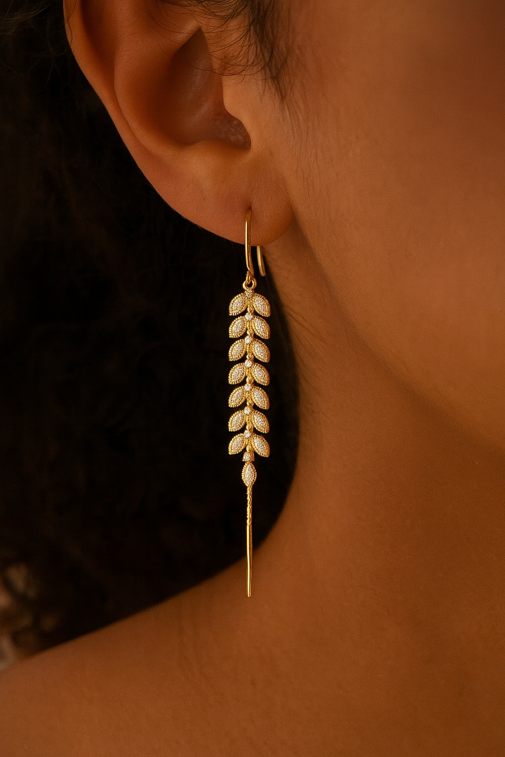 Grace your look with the Golden Wheat Earrings, crafted from genuine 925 sterling silver and plated in 14k gold. Featuring delicate leaf-shaped details with sparkling stones, these earrings offer an elegant, nature-inspired design with graceful movement.